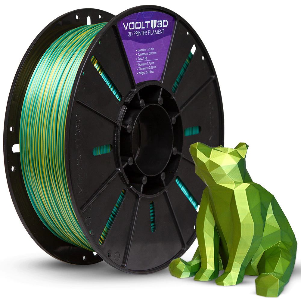 Filamento premium PLA Duo Color Dorado y Verde de alta calidad para impresión 3D. Fabricación propia con los más altos estándares de calidad.